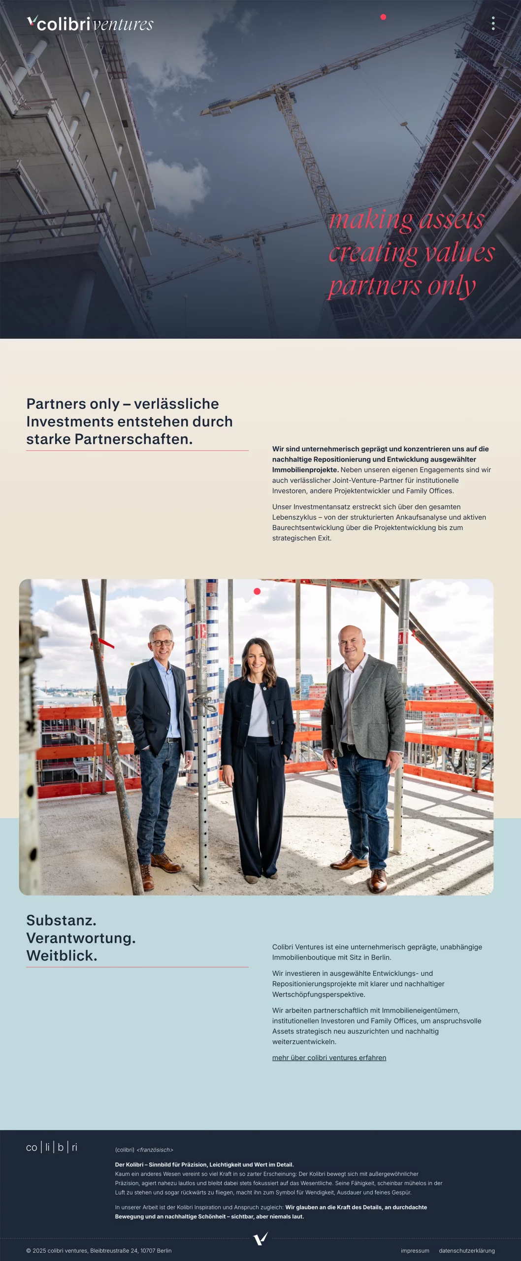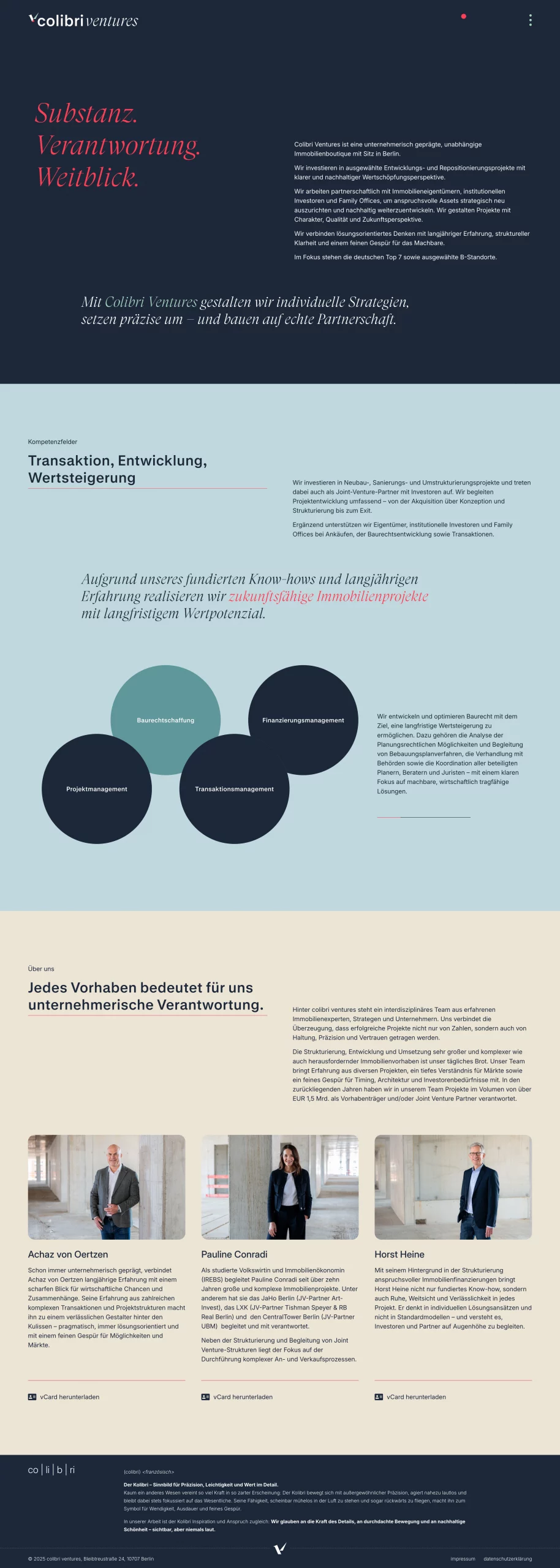 Für Colibri Ventures entstand der vollständige visuelle und digitale Auftritt – von der frühen Klärung der Markenhaltung bis zur technisch umgesetzten Website.